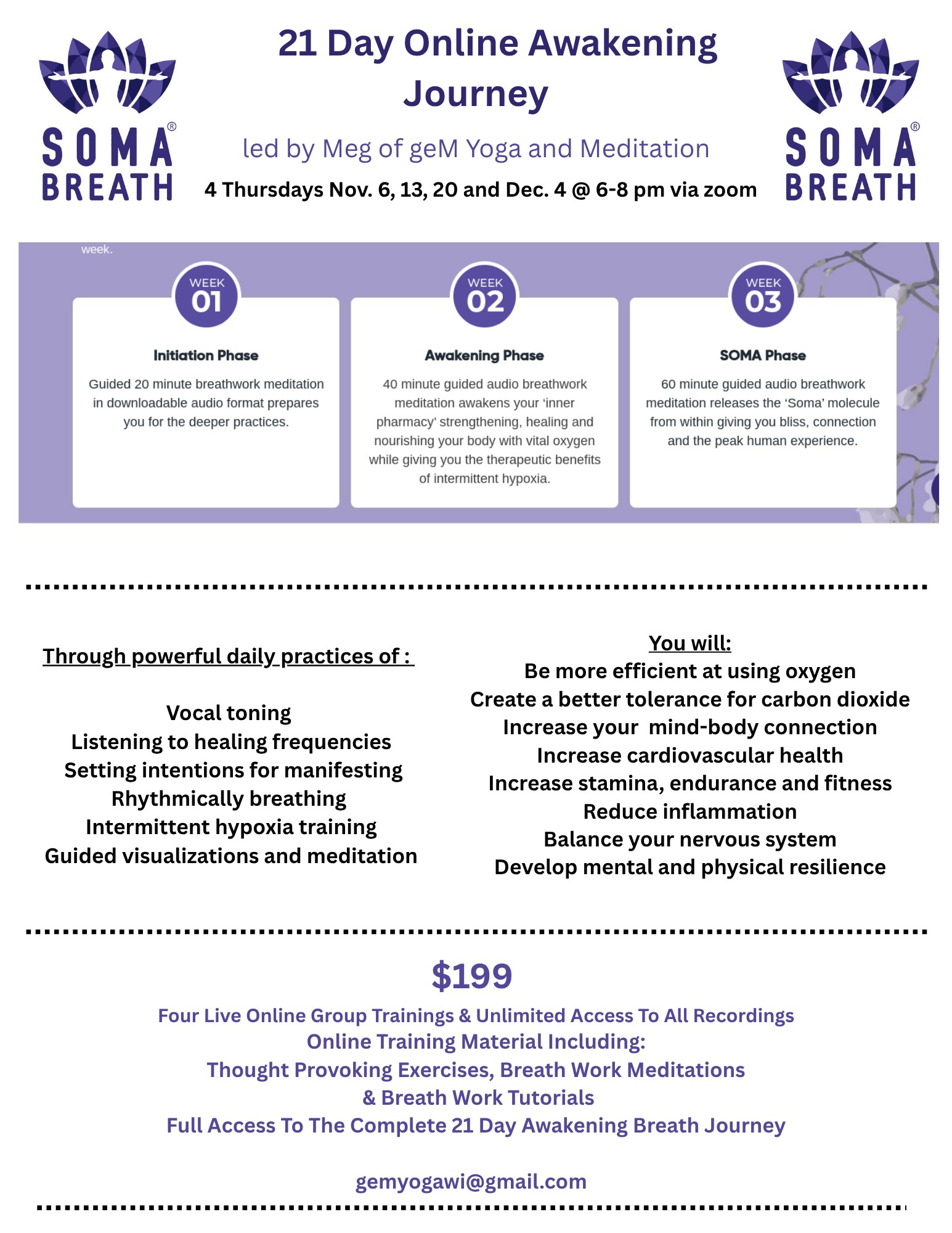 SOMA Breath Journey- a 90-120 minute live-in-person session similar to the Energetic Meditation but designed to go deeper into the experience with 4-5 rounds of rhythmic breathing. $25