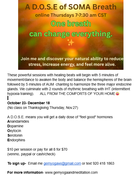 Energetic Meditation- Offered live in person $15 and live online via ZOOM $10. a one hour thematic session with elevating music, ambidexterous movement and dance, AUM chanting, guided meditation and visualizations and 2-3 rounds of rhythmic breathing and IHT.