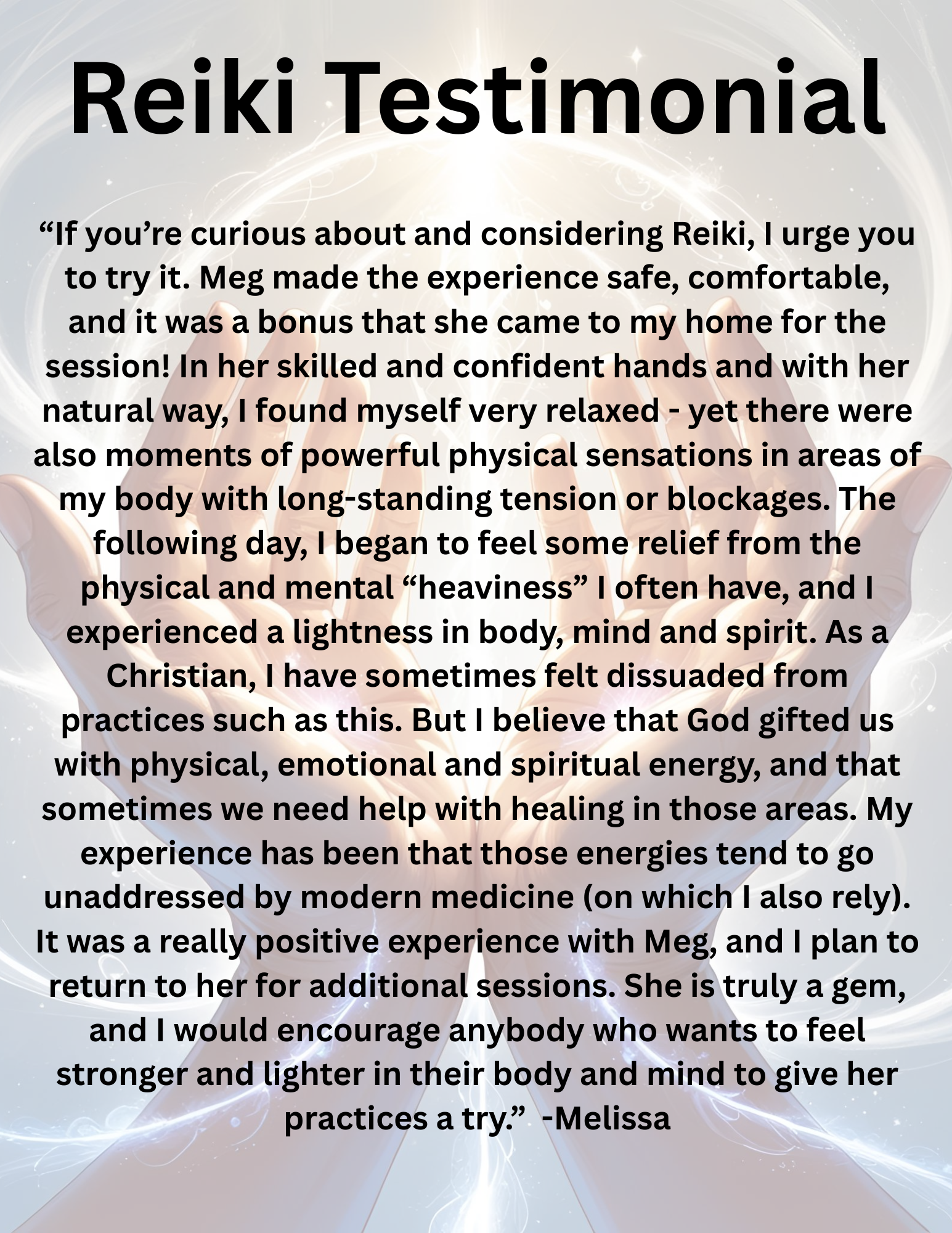 The word Reiki is made of two Japanese words - Rei which means "God's Wisdom or the Higher Power" and Ki which is "life force energy". Reiki is actually "spiritually guided life force energy." Reiki is a Japanese technique for stress reduction and relaxation that also promotes healing. Reiki is shared with no touch or a light touch of the reiki practitioner’s palms on the participant’s body. A treatment feels like a wonderful glowing radiance that flows through and around you. Reiki treats the whole person including body, emotions, mind and spirit creating many beneficial effects that include relaxation and feelings of peace, security and well-being. While Reiki is spiritual in nature, it is not a religion. It has no dogma, and there is nothing you must believe in order to learn and use Reiki. In fact, Reiki is not dependent on belief at all and will work whether you believe in it or not. Because Reiki comes from God, many people find that using Reiki puts them more in touch with the experience of their religion rather than having only an intellectual concept of it.