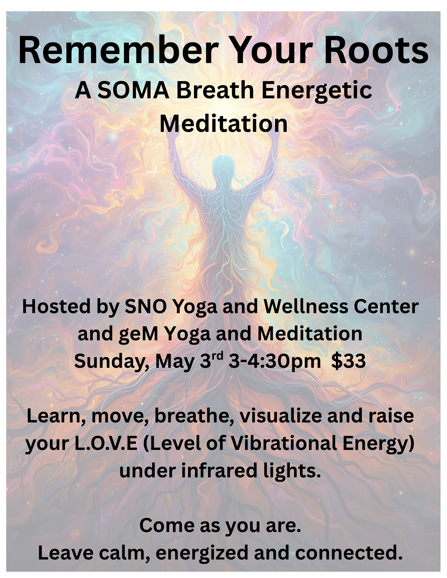 SOMA Breath Journey- a 90-120 minute live-in-person session similar to the Energetic Meditation but designed to go deeper into the experience with 4-5 rounds of rhythmic breathing.